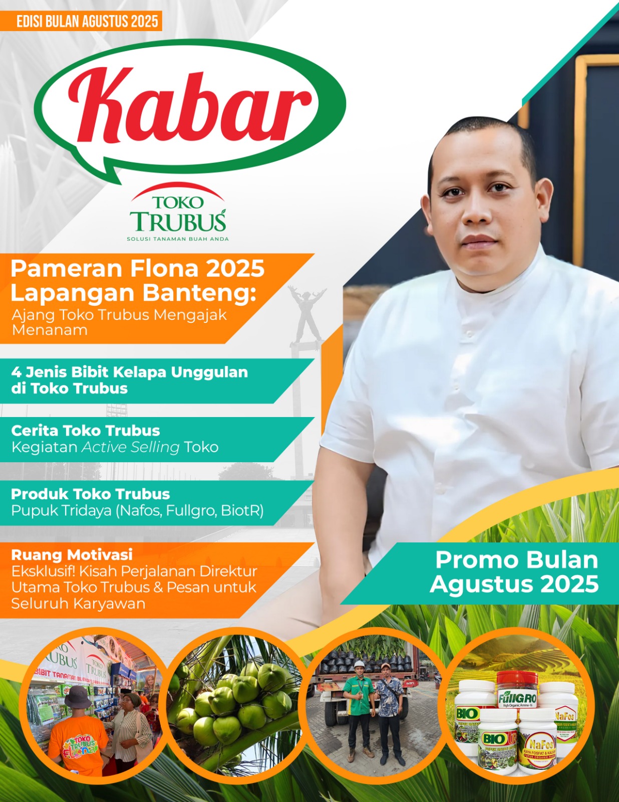 Kabar Toko Trubus Edisi Agustus 2025 berisi info seputar Pameran Flona 2025, Cerita Toko Trubus, Produk Toko Trubus, Ruang Motivasi, & Promo Bulan Agustus (Kelapa).