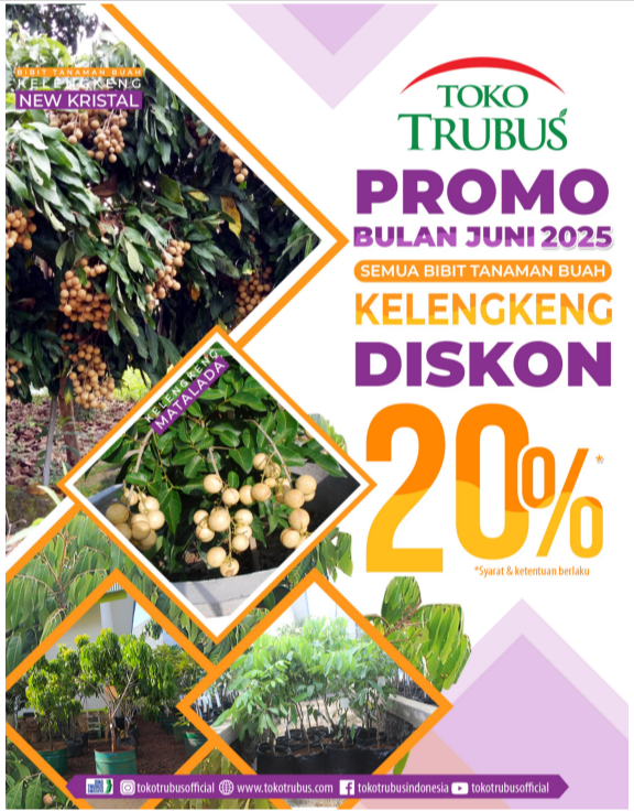 Kabar baiknya, ada promo spesial sepanjang bulan Juni khusus untuk bibit pohon kelengkeng! Jangan lewatkan kesempatan ini! Temukan bibit kelengkeng pilihan hanya di Toko Trubus! Toko Trubus, Solusi Tanaman Buah Anda!