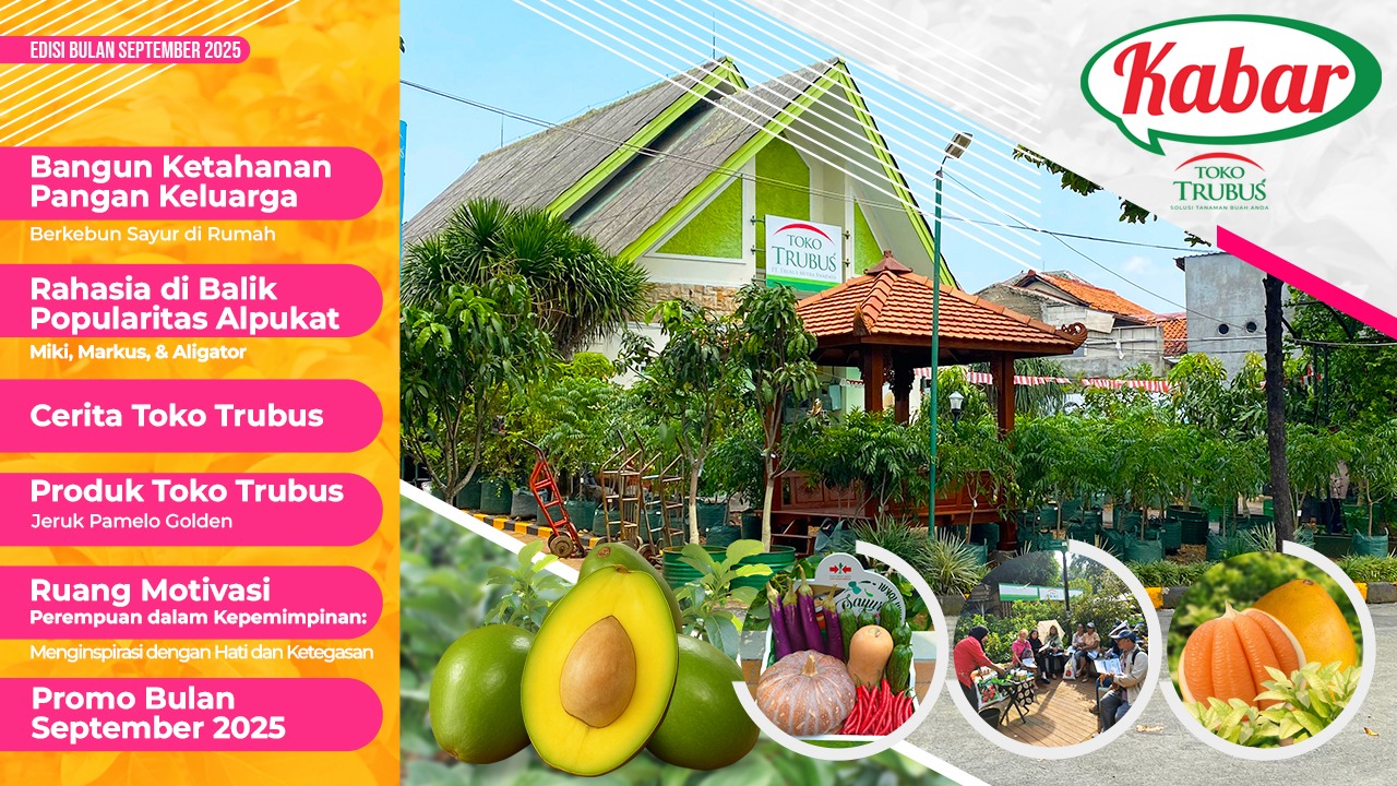 Kabar Toko Trubus Edisi September 2025 berisi informasi tentang Ketahanan Pangan, Promo Alpukat, Cerita Toko Trubus, Produk Toko Trubus, & Ruang Motivasi.